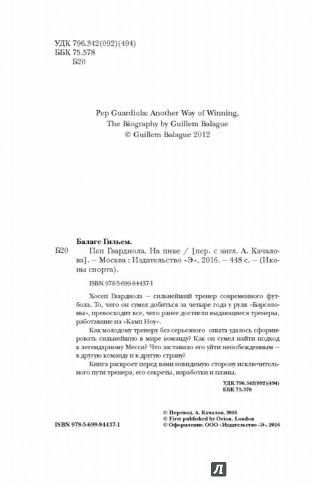 Хосеп Гвардиола - сильнейший тренер современного футбола. То, чего он сумел добиться за четыре года у руля "Барселоны", превосходит все, чего ранее достигли выдающиеся тренеры, работавшие на "Камп Ноу". Он покорил мир своей утонченностью, проницательностью, рабочей этикой, верой в молодежь и безупречной подготовкой к матчам. Он сумел создать стиль игры, который другие клубы стремятся копировать, - зрелищный, тонкий, комбинационный футбол. Как молодому тренеру без серьезного опыта удалось сформировать сильнейшую в мире команду? Как он сумел найти подход к легендарному Месси? Что заставило его уйти непобежденным - в другую команду и в другую страну? Книга раскроет перед вами невидимую сторону исключительного пути тренера, его секреты, наработки и планы. Предисловие сэра Алекса Фергюсона. "Великолепно", - The Huffington Post "...обязательно к прочтению", -World Soccer Talk