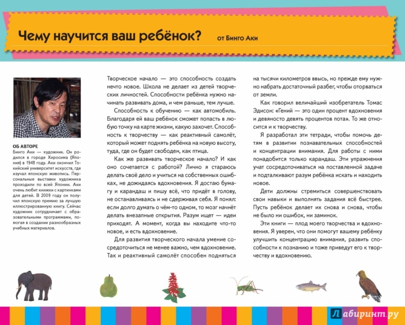 О книге "Найди пару. Уровень 2" - продолжение тетради "Найди пару. Уровень 1". Она научит ребёнка сохранять внимание и поможет развить его память. Умение сосредоточиваться - важный инструмент для достижения успехов в учебе. Задания в тетради направлены на поиск одинаковых картинок: животных, цветов, фруктов, ягод, овощей и т. д. Всего на каждой странице расположено от 24 до 40 парных изображений. Тетрадь не только научит ребенка концентрироваться на поставленных задачах, но и расширит его словарный запас на тему живой природы. О формате тетрадей "Найди пару" Тетради серии "Найди пару" развивают за счет тренировки разных навыков и выполнения игровых упражнений творческие способности ребенка. Ведь для развития творческого начала умение сосредотачиваться не менее важно, чем вдохновение. Именно концентрация на одном деле и упорная тренировка навыков помогает добиться успехов в любом деле. Сосредоточенность на процессе учит ребенка искать новые решения, совершенствоваться и изобретать. Как построены задания в тетради? Все упражнения в тетради выстроены по принципу "от простого к сложному". Каждое упражнение развивает целый спектр навыков. Напротив каждого упражнения есть шкала оценок: родителям предлагается засечь время, за которое малыш выполнил задание, и оценить его работу. Все оценки положительные, а значит станут отличной мотивацией для ребенка. Все задания в тетради яркие и игровые, они расширяют кругозор и обогащают словарный запас. Что нужно делать взрослому? Если ваш ребенок еще не научился работать простым карандашом, то для начала можно использовать восковой карандаш или фломастер. На каждой странице нужно найти пары для 4-20 картинок. Ребенок должен искать одинаковые изображения: например, двух жирафов, двух слонов и т. д. Если все пары на странице найдены, задание выполнено. Ничего страшного, если, обводя картинки, ребенок будет проводить неровные линии. Главное, чтобы он находил пары и ему нравилось выполнять упражнения. Если у ребенка возникают затруднения, не торопите его. Пусть он выполняет задания, не беспокоясь о времени. Если он не справится самостоятельно, предложите свою помощь. Каждая картинка подписана, но ребенку не нужно зачитывать подписи вслух. Когда он выполнит задание, вы можете назвать некоторых животных. Например, скажите: "Это жираф" - и укажите на соответствующее изображение Советы родителям - Засекайте, сколько времени нужно вашему ребенку на выполнение задания на каждой странице, и заносите результат в таблицу ниже. - После выполнения всех упражнений сравните результаты первых и последних заданий. Вы наверняка заметите, что ребенок стал быстрее справляться с упражнениями. - Обязательно хвалите ребенка после выполнения каждого упражнения. Для кого эта тетрадь? Тетрадь предназначена для занятий с детьми 4-6 лет. Ее могут использовать как педагоги в детских садах, клубах и центрах развития, так и родители для работы дома. Что такое KUMON? KUMON - это крупнейший международный центр дополнительного образования. Сегодня по программам KUMON обучаются в 48 странах более 4 млн детей и подростков в возрасте от 2 до 17 лет. Рабочие тетради KUMON для дошкольников помогут вашему ребёнку приобрести навыки письма, счёта, а также научат его работать с ножницами и клеем. Задания, разработанные по методике KUMON: Тренируют внимание и 