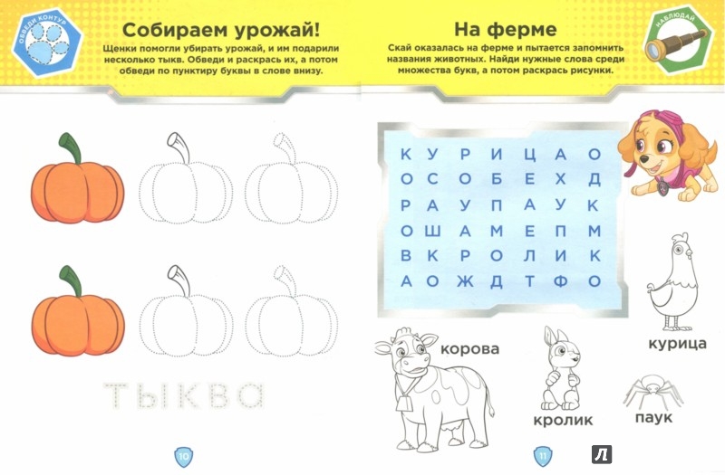 Любимые всеми герои "Щенячьего патруля" учат детей различать и сравнивать формы и размеры, находить недостающие детали, читать и правильно писать буквы и цифры, знакомят с новыми словами и понятиями.