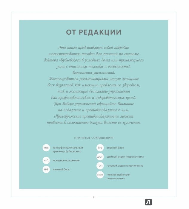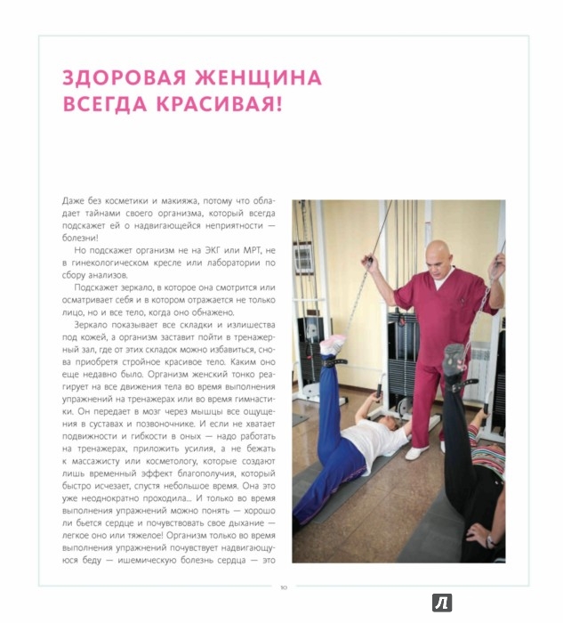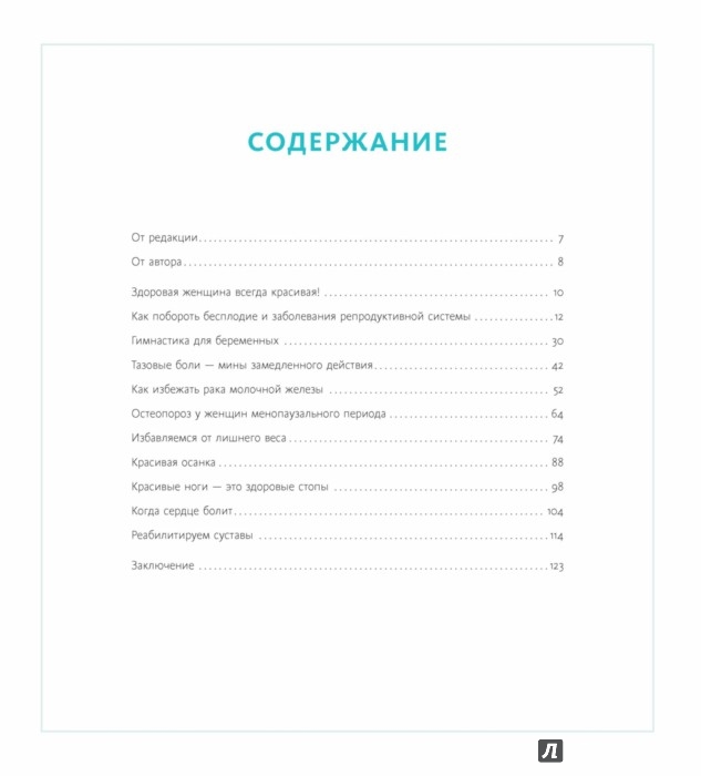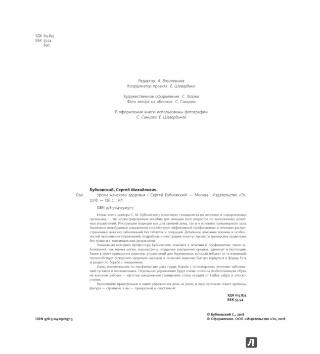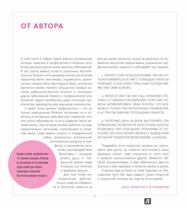 Новая книга доктора С. М. Бубновского, известного специалиста по лечению и оздоровлению организма, - это иллюстрированное пособие для женщин всех возрастов по выполнению целебных упражнений. Инструкции подходят как для занятий дома, так и в условиях тренажерного зала. Тщательно подобранные упражнения способствуют эффективной профилактике и лечению распространенных женских заболеваний без таблеток и операций. Детальное описание техники и особенностей выполнения упражнений, подробные иллюстрации помогут провести тренировку правильно, без травм и с максимальным результатом. Уникальная методика профессора Бубновского поможет в лечении и профилактике таких заболеваний, как миома матки, эндометриоз, опущение внутренних органов, аднексит и бесплодие. Также в книге приводится комплекс упражнений для беременных, который избавит от осложнений, поспособствует рождению здорового малыша и позволит мамочке быстро вернуться в форму. Есть и раздел по борьбе с ожирением! Даны рекомендации по профилактике рака груди, борьбе с остеопорозом, лечению заболеваний суставов и позвоночника. Отдельные упражнения будут очень полезны любительницам обуви на высоком каблуке - простые ежедневные тренировки стопы оградят от Hallux valgus и плоскостопия. Выполняйте приведенные в книге упражнения день за днем, и ваш организм станет крепким, фигура - стройной, а вы - прекрасной и счастливой!