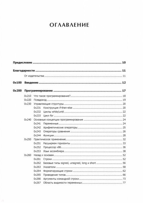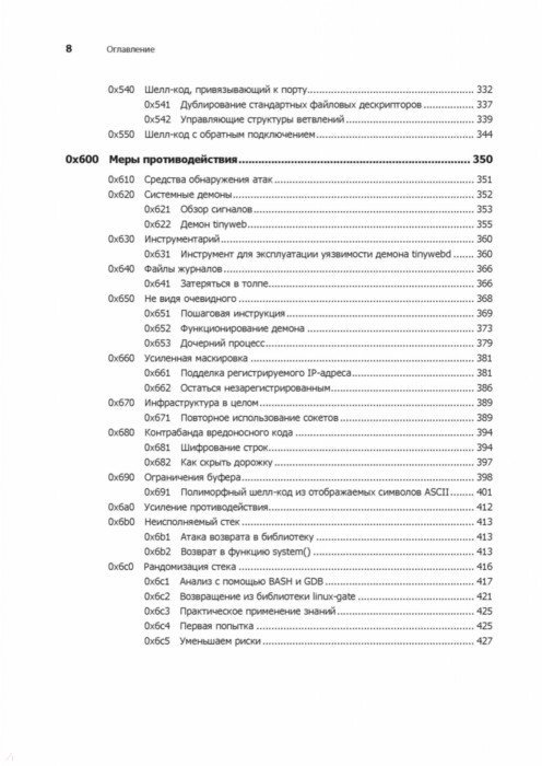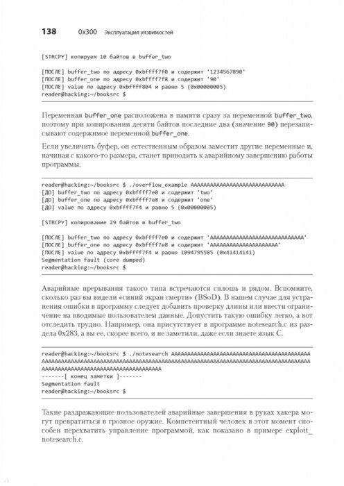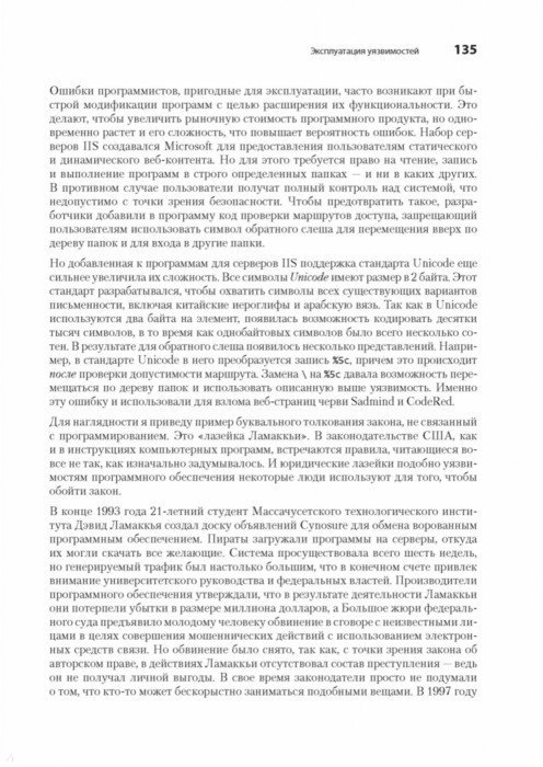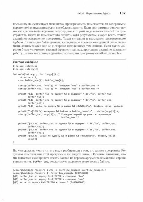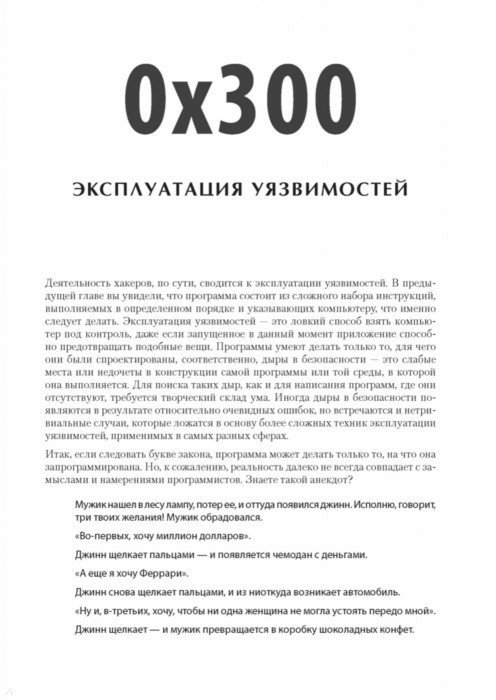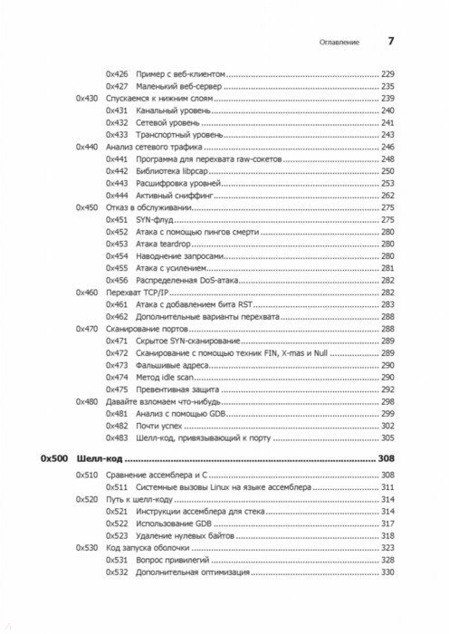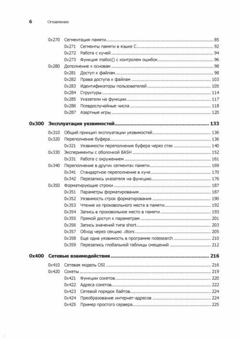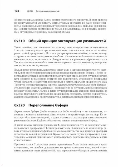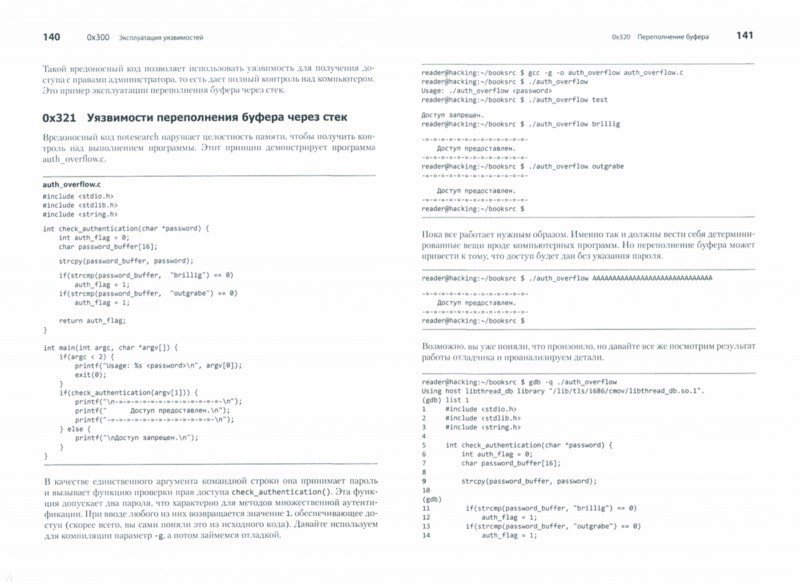 Каждый программист по сути своей - хакер. Ведь первоначально хакингом называли поиск искусного и неочевидного решения. Понимание принципов программирования помогает находить уязвимости, а навыки обнаружения уязвимостей помогают создавать программы, поэтому многие хакеры занимаются тем и другим одновременно. Интересные нестандартные ходы есть как в техниках написания элегантных программ, так и в техниках поиска слабых мест. С чего начать? Чтобы перезаписывать память с помощью переполнения буфера, получать доступ к удаленному серверу и перехватывать соединения вам предстоит программировать на Си и ассемблере, использовать шелл-код и регистры процессора, познакомиться с сетевыми взаимодействиями и шифрованием и многое другое. Как бы мы ни хотели верить в чудо, программное обеспечение и компьютерные сети, от которых зависит наша повседневная жизнь, обладают уязвимостями. "Мир без хакеров - это мир без любопытства и новаторских решений". Джон Эриксон 2-е издание