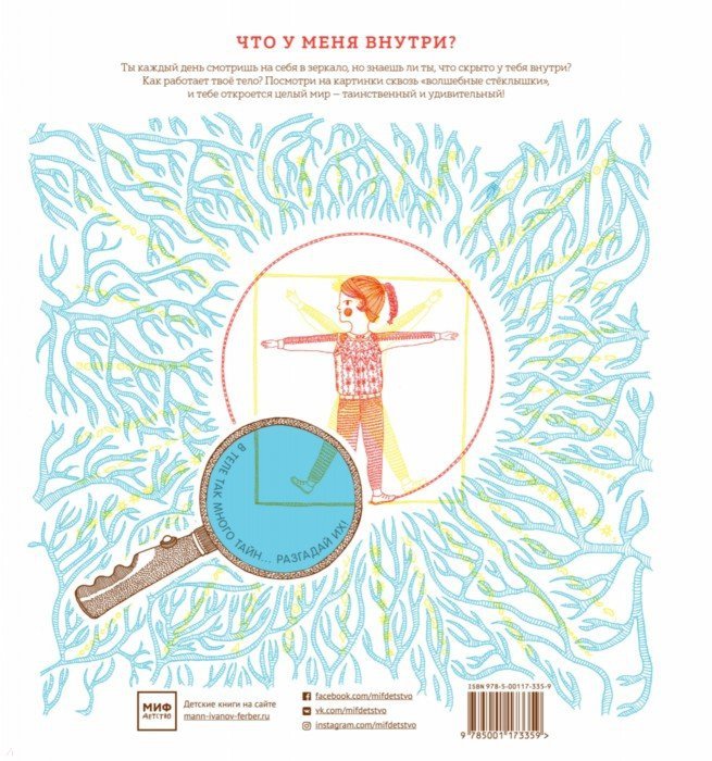 О книге Ты каждый день смотришь на себя в зеркало, но знаешь ли ты, что скрыто у тебя внутри? Как работает твоё тело? Посмотри на картинки сквозь "волшебные стёклышки", и тебе откроется целый мир - таинственный и удивительный! Вместе с "волшебными лупами" мы увидим и узнаем: зачем нужны кости и что такое скелет; сколько мышц в теле человека; как выглядит наше сердце и легкие; куда попадает пища, которую мы съедаем; зачем нам нужна кровь; как развивается маленький человек в животе у мамы. И еще много-много другой интересной информации об устройстве нашего тела. Изучение нового в этой книге дается не через текст (его здесь совсем не много), а через возможность заглянуть прямо внутрь иллюстраций (для этого нужны "волшебные стёклышки") и почувствовать себя ученым-исследователем. "Твоё тело - твой дом", - говорится в книге. Так давайте узнаем его поближе! Фишки книги ВАУ-формат: 3 волшебные разноцветные лупы, которые покажут скрытое для обычного глаза строение человеческого тела, - как будто мы можем видеть насквозь! Простые, но впечатляющие и интересные факты про устройство человеческого организма. Книга-игра - просто и увлекательно о сложном. Для кого эта книга Для детей от 4 лет. Об авторе Айна Бестард - иллюстратор и дизайнер по текстилю. Изучала графический дизайн в Школе дизайна (ESDi) в Барселоне. Работала в fashion-индустрии с Miro Jeans, Woman's Secret и Camper. Также Айна иллюстрирует детские книги, создает виниловые наклейки и обои для оформления интерьеров.