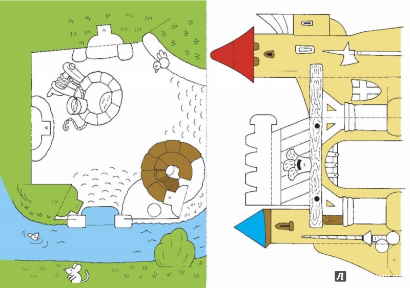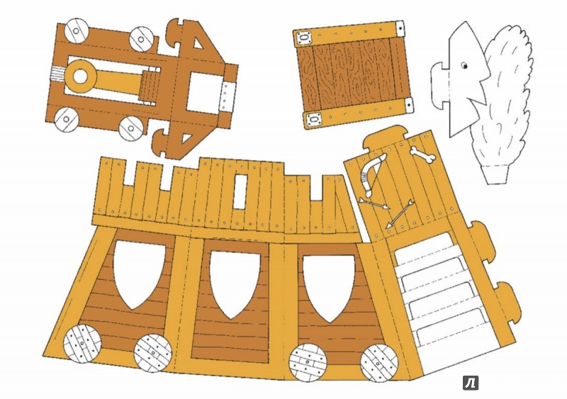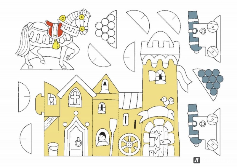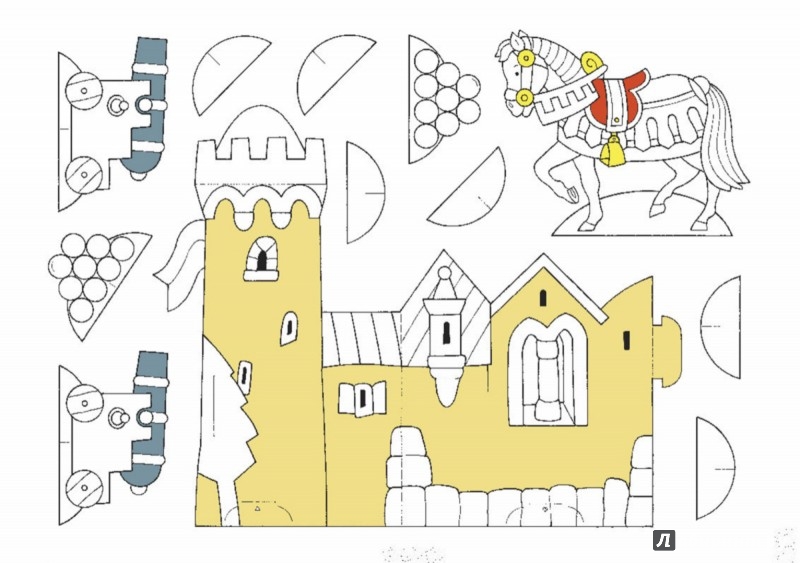Без клея и ножниц построй настоящий рыцарский замок и устрой его осаду: замок, король, принцесса, 3 рыцаря, 2 шута, 2 пушки, осадная башня, ядра, катапульта - и конечно боевой конь!