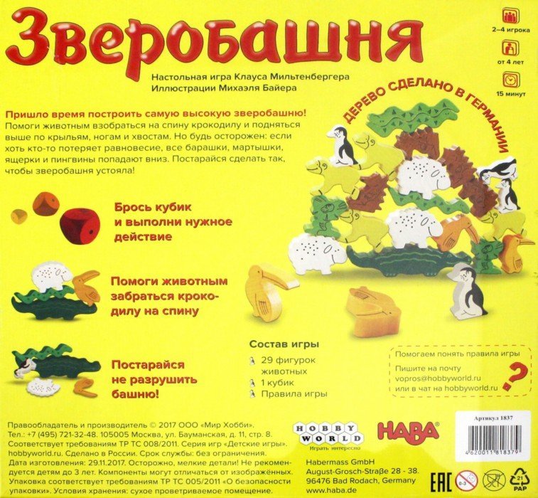 Пришло время построить самую высокую зверобашню! Помоги животным взобраться на спину крокодилу и подняться выше по крыльям, ногам и хвостам. Но будь осторожен: если хоть кто-то потеряет равновесие, все барашки, мартышки, ящерки и пингвины попадают вниз. Постарайся сделать так, чтобы зверобашня устояла! Состав: 29 фигурок животных, 1 кубик, правила игры. 4+. Сделано в России.